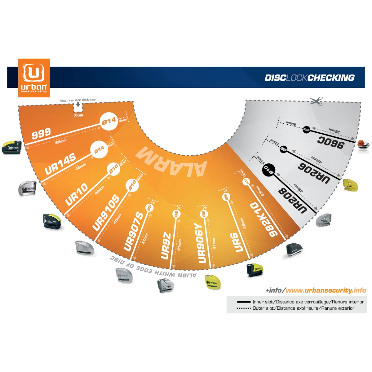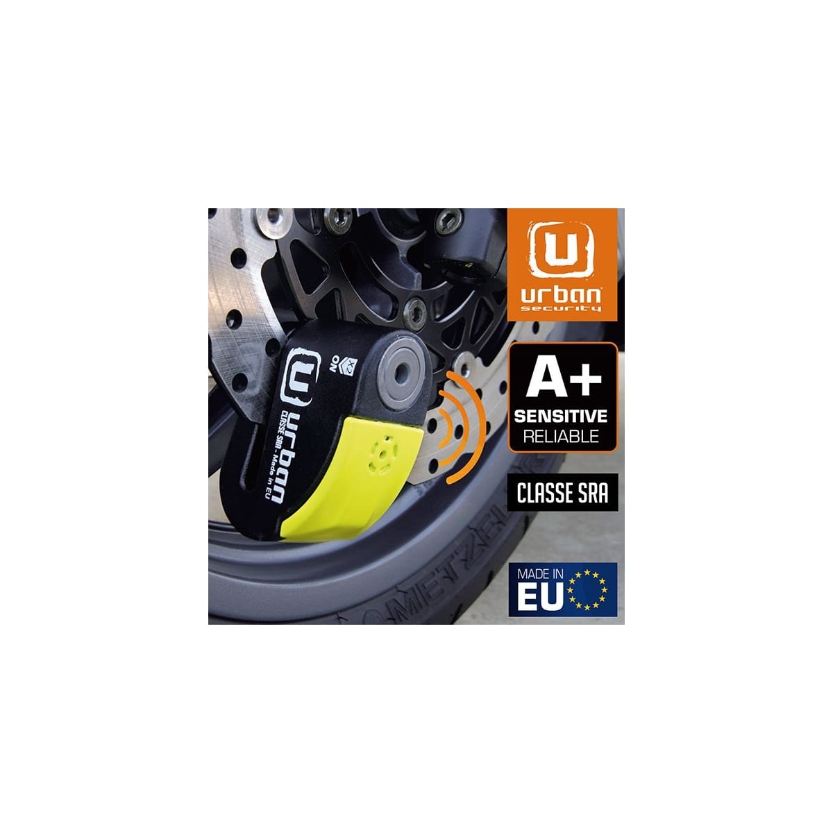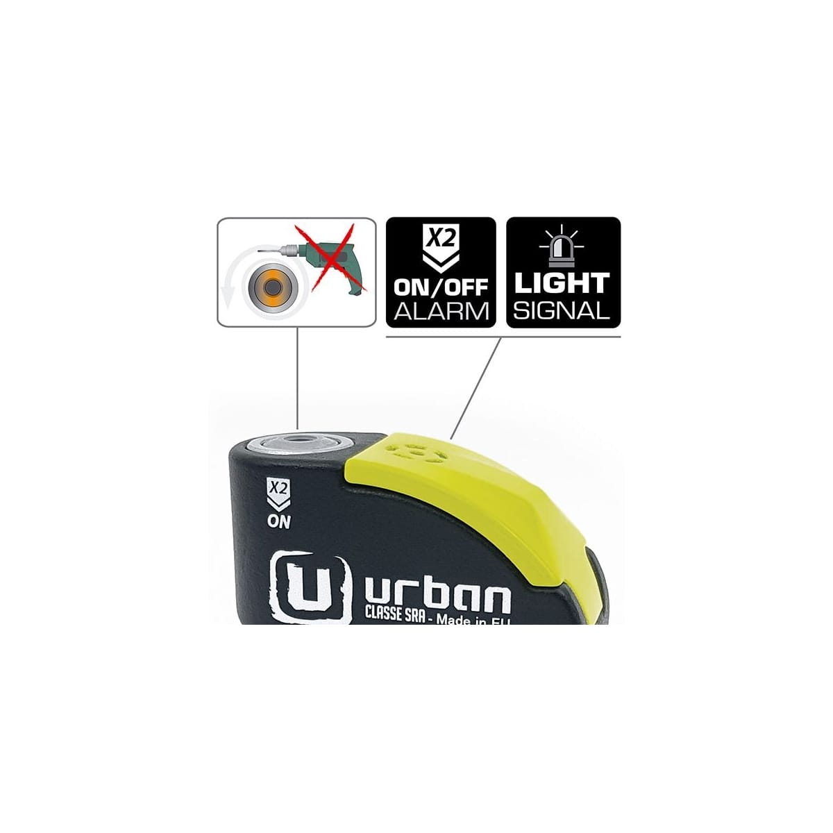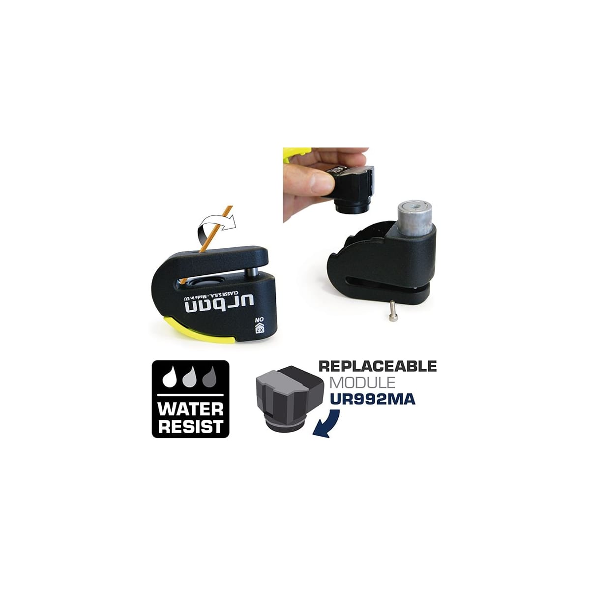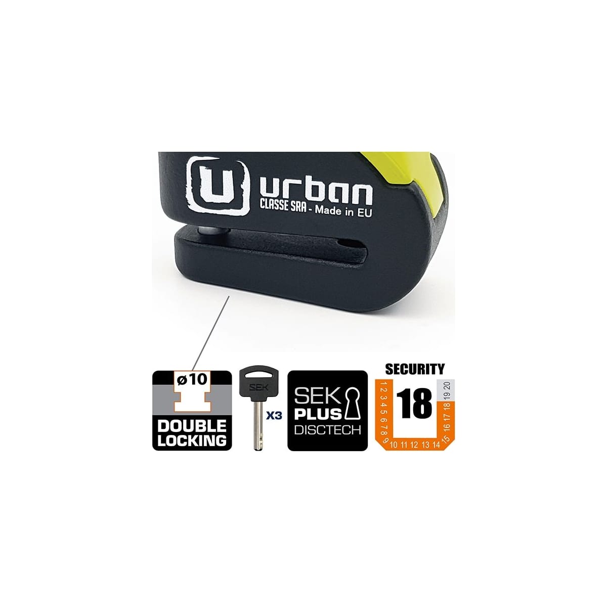 Urban vous présente son bloque disque avec alarme, le Urban UR10, en noir et jaune.