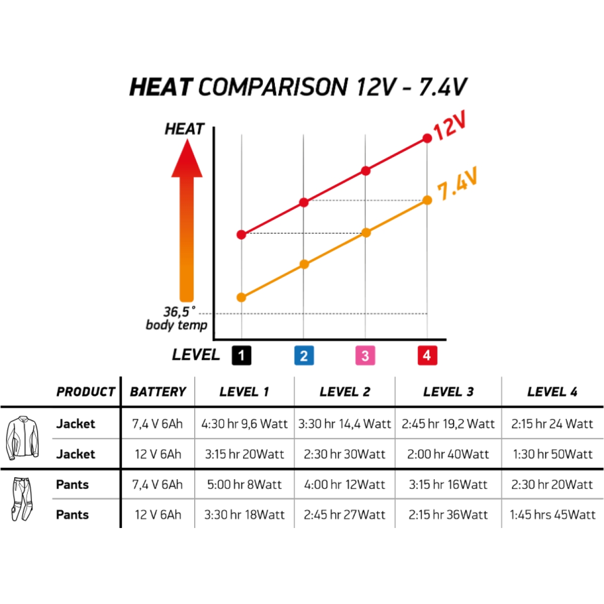 Cette batterie adaptable aux vestes et pantalons, est dotée d'un voltage à 7.4 Volts avec 6 Ampères.