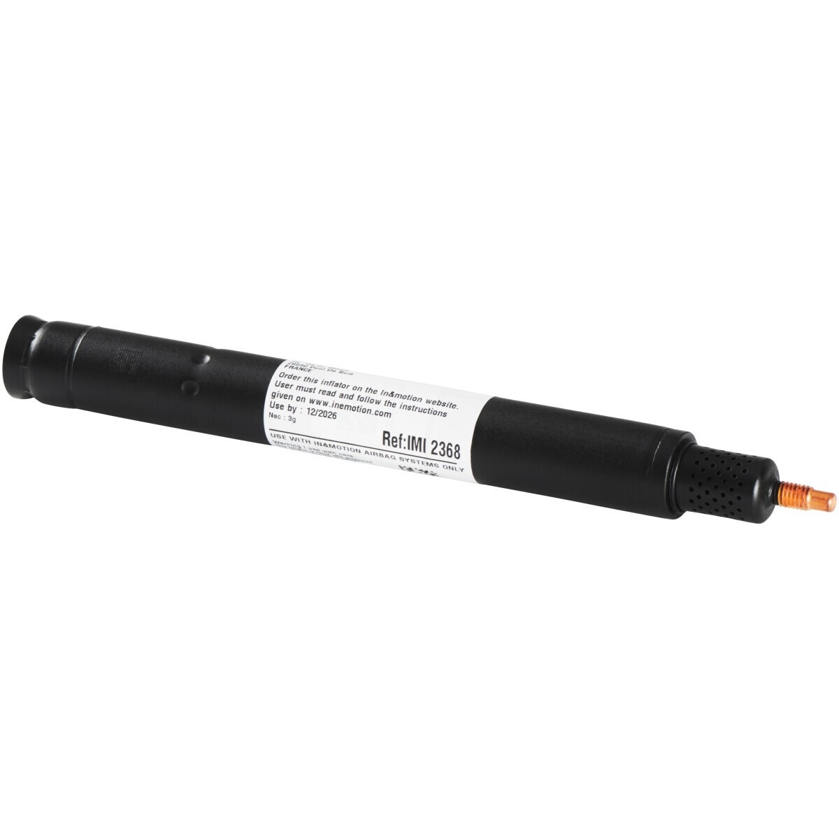 Cette cartouche de gaz est à remplacer chaque fois que le gilet se déclenche. Veuillez faire très attention lors du remplacement de la cartouche, il faut suivre le protocole d'après-gonflage disponible sur l'application mobile d'In&Motion : "MyIn&Box". La cartouche est livré avec un embout de contrôle protégeant la capsule.