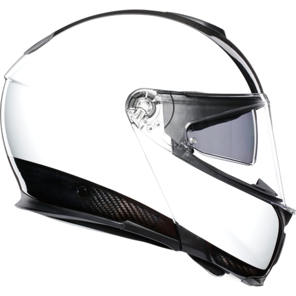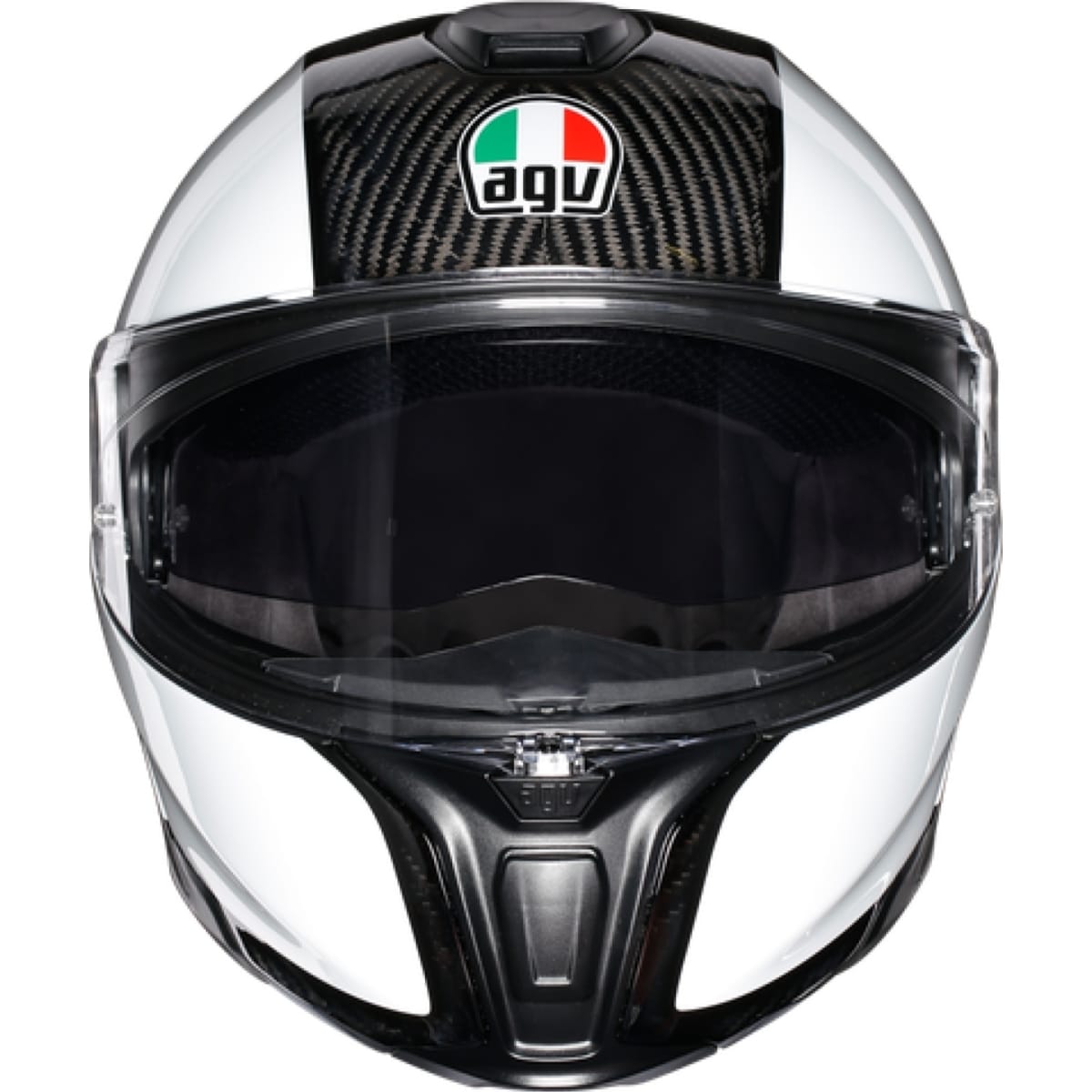 AGV vous présente son casque moto, le Sportmodular Solid MPLK en coloris noir carbone et blanc.
