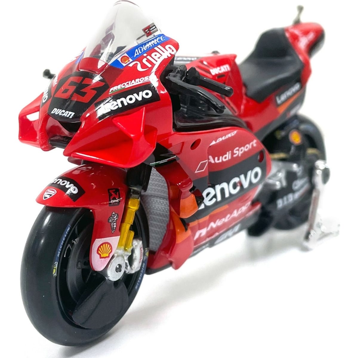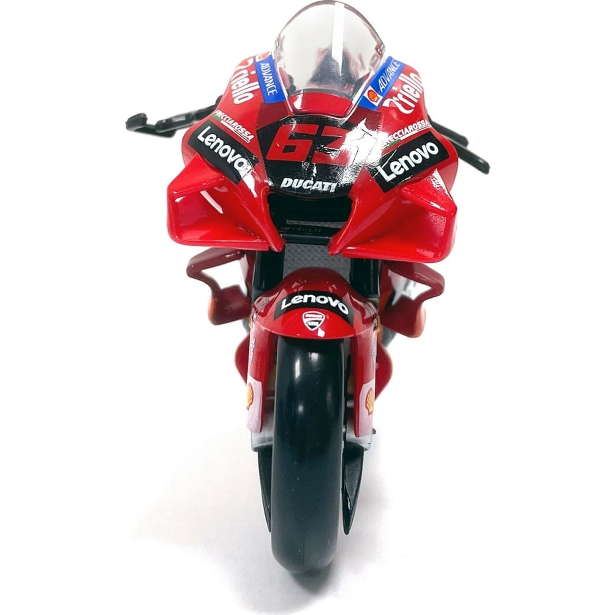Cette miniature est la reproduction de la moto du célèbre pilote GP Francesco Bagnaia qui porte le numéro de course 63. Une bonne idée cadeau pour les passionnés ou pour les plus petits !